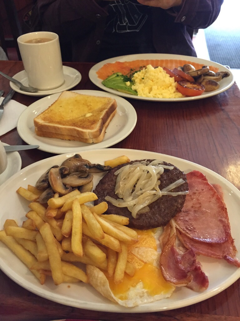 Speedy’sの方は、バーガー(日本だと薄いハンバーグ。イギリスやドイツだとハンバーガーのパテの部分をそう呼ぶらしい。)に炒めた玉ねぎ、マッシュルーム、目玉焼き、ベーコンとフレンチフライ。それぞれトースト付き。